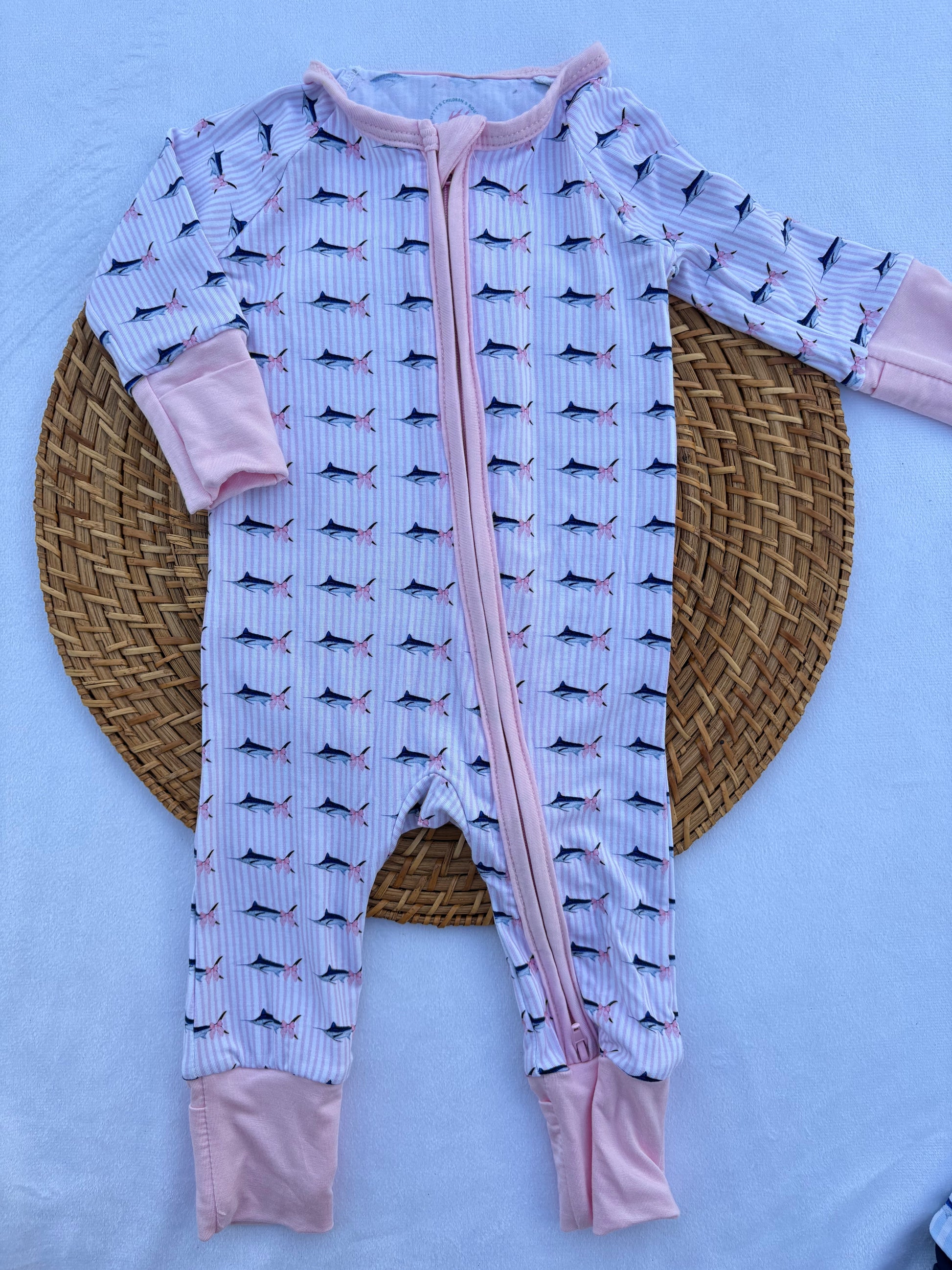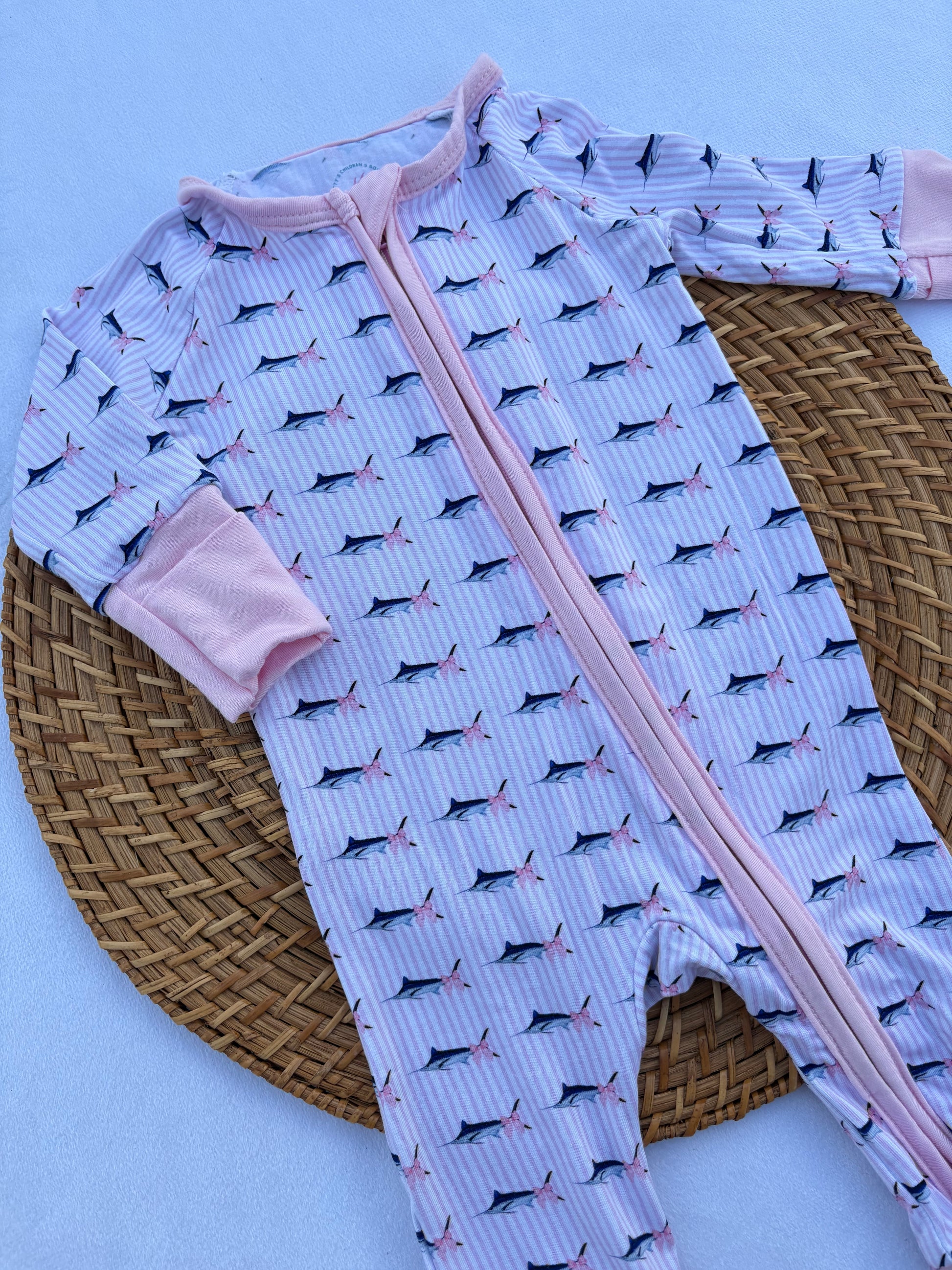 Reel in the cuteness with our Marlin & Bows bamboo zippy! Pink stripes, a playful marlin, and the sweetest bow detail on the tail make this one a must-have for your little beach babe. Soft, breathable, and ready for summer adventures!