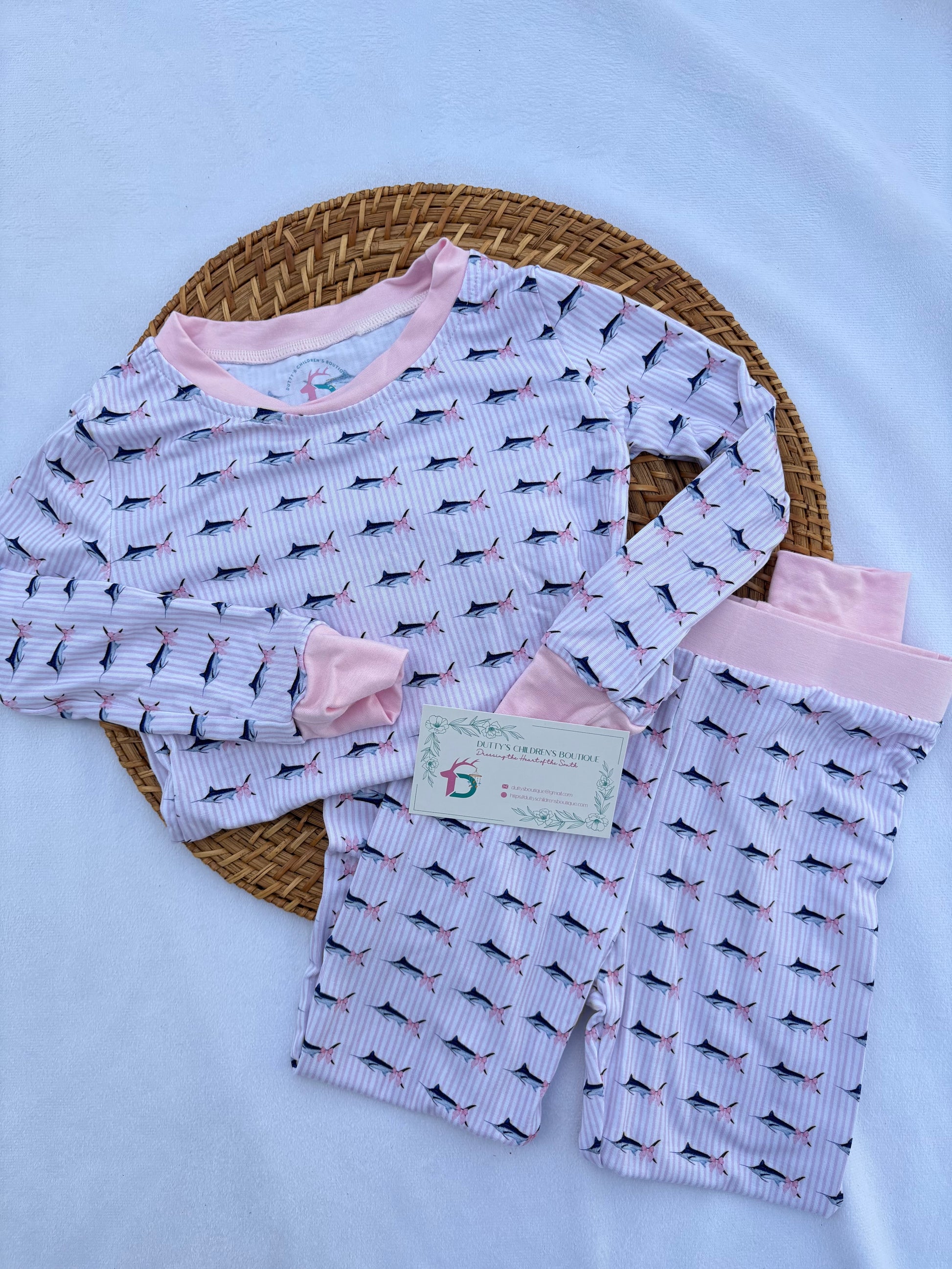 Hooked on cuteness! Our custom bamboo sleeper set features a pink striped background, a bold marlin, and the sweetest little bow on the tail—designed with love and perfect for your beach babe.