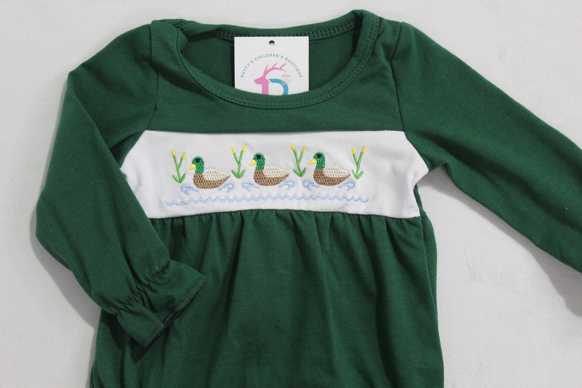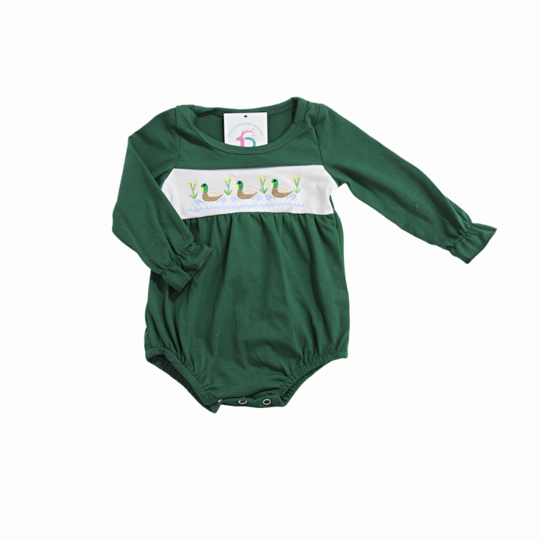 Introducing our Duck Girls Long Sleeve, the perfect addition to your little one's wardrobe. This green king sleeve onsie features adorable, embroidered ducks for a playful touch. Made for girls, this comfortable and stylish piece will keep your child cozy while adding a touch of cuteness to any outfit.