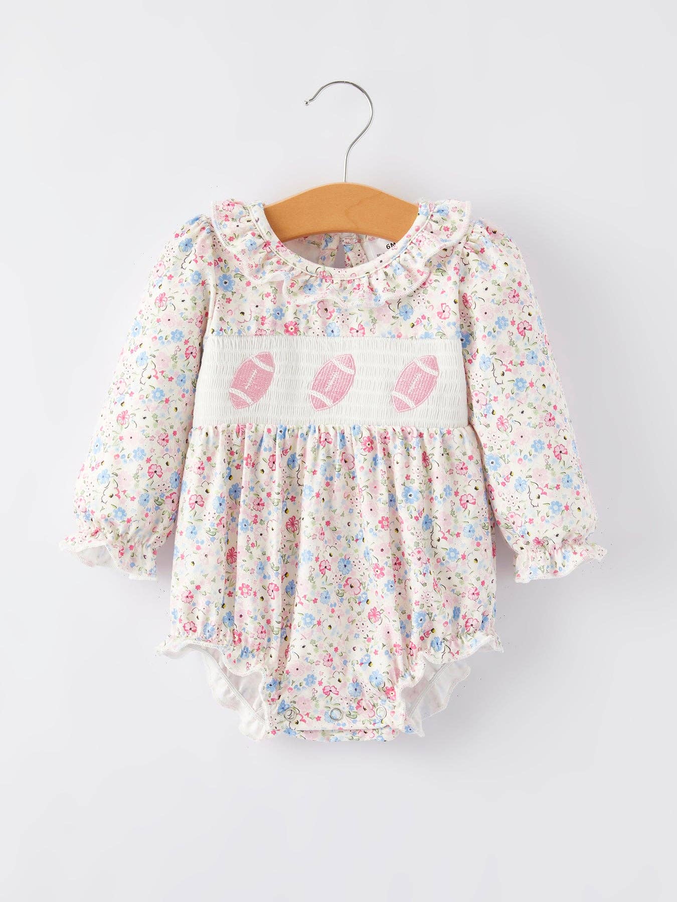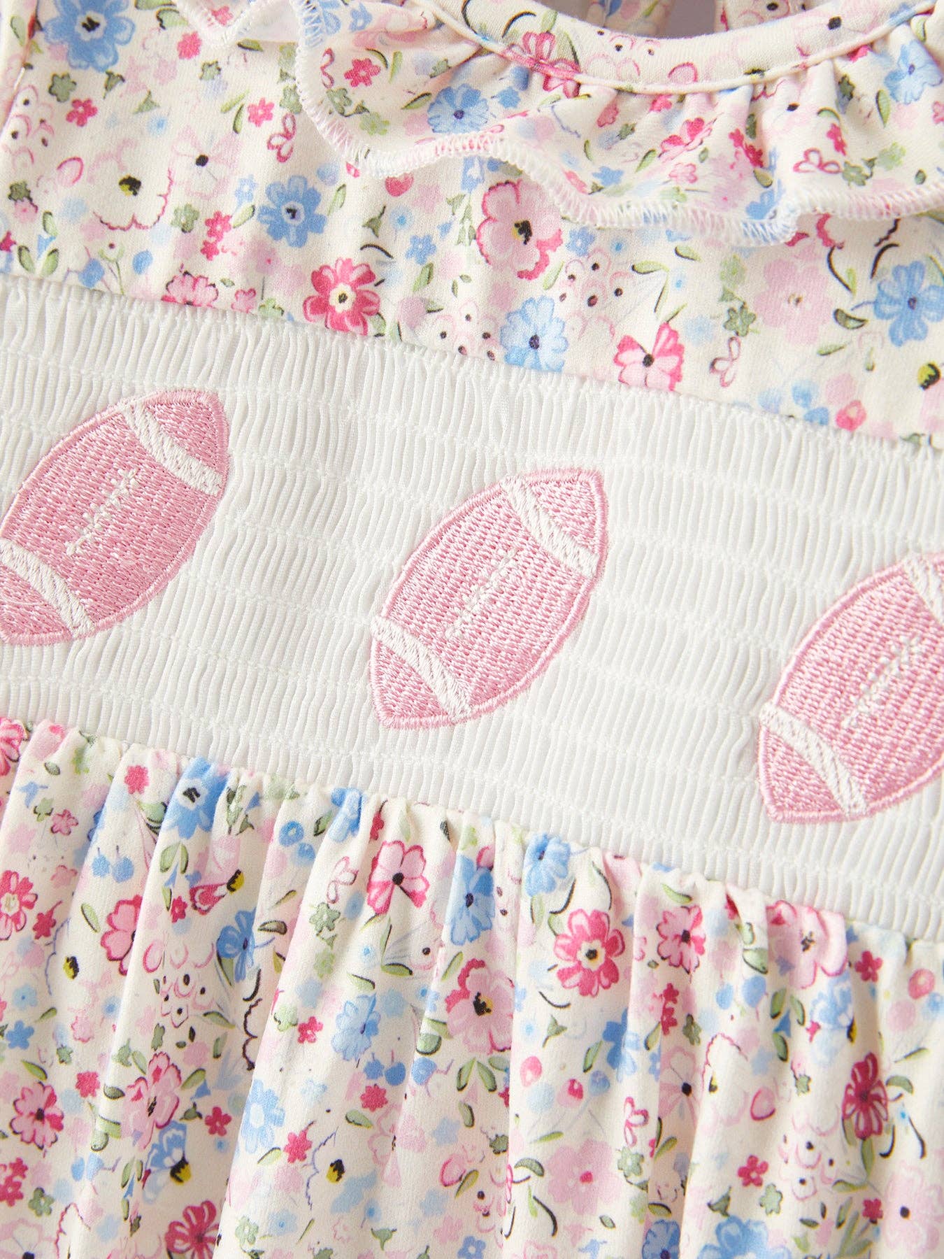 Score a touchdown with this Football Smocking Embroidered Girls Romper! With its unique design and charming smocked detailing, your little one will be both stylish and comfortable. Perfect for any football fan, this romper is a must-have for game days and everyday wear. Order now and show off your team spirit!