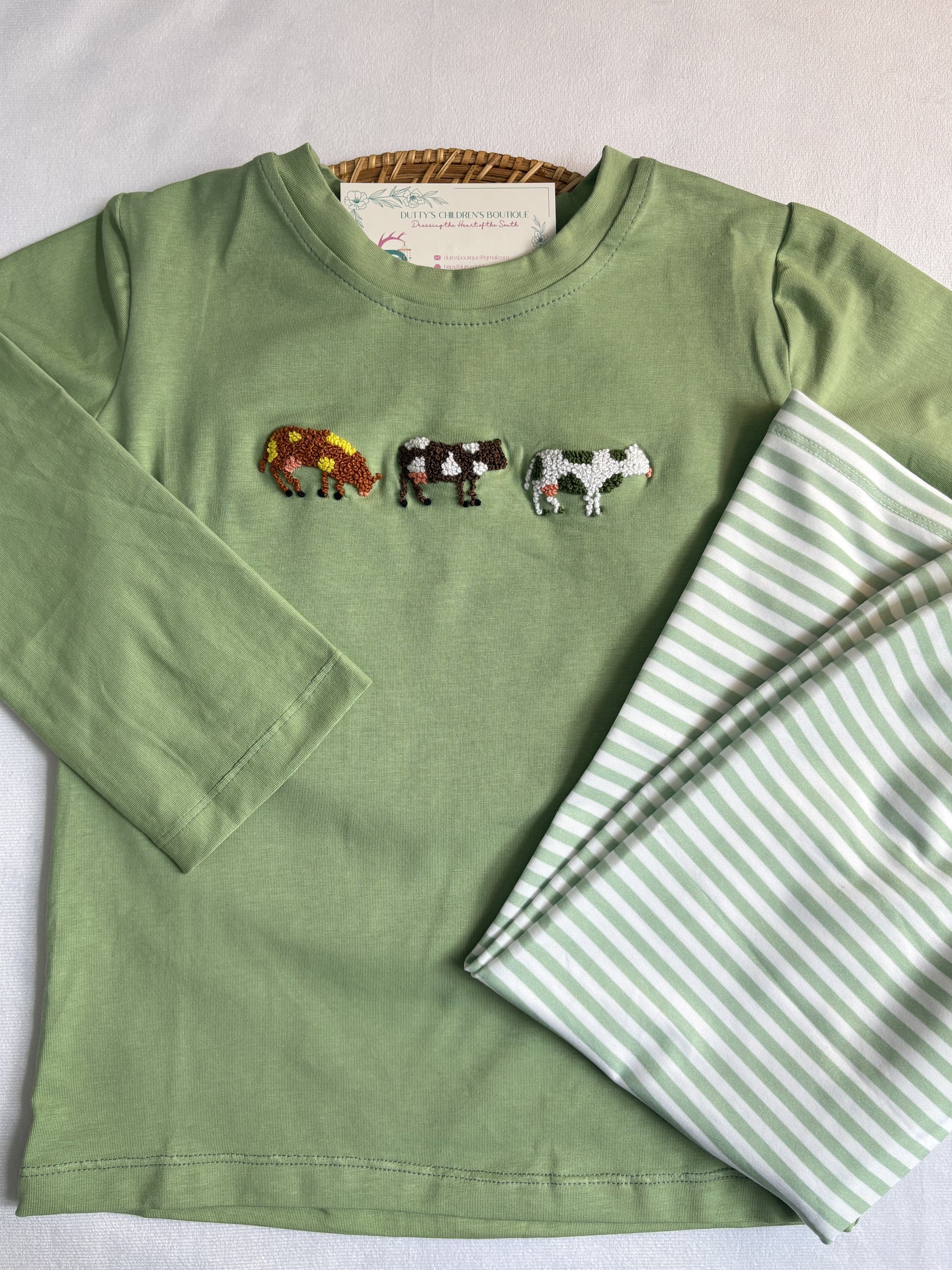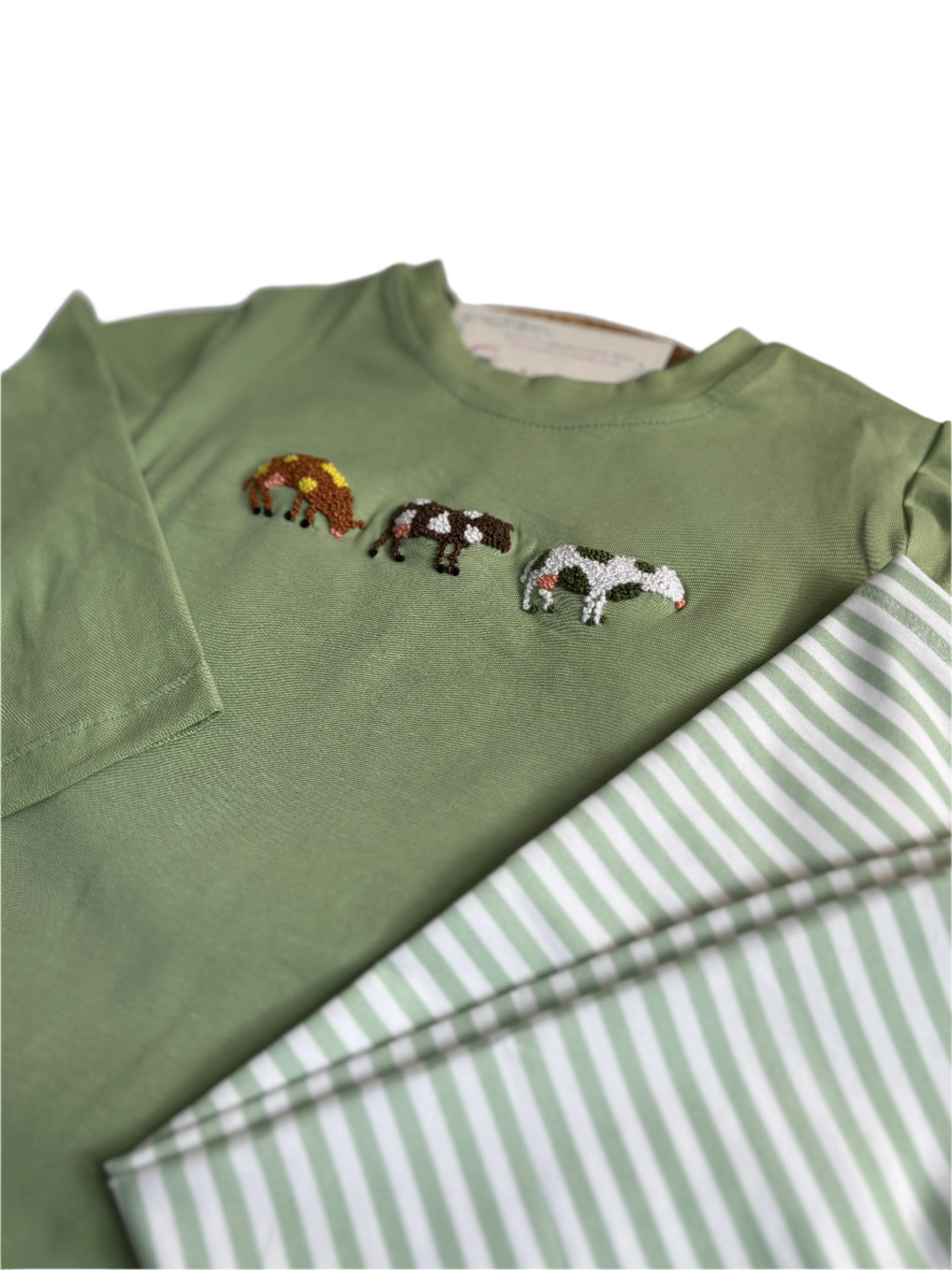 Experience ultimate comfort and style with our Moos and Meadows Set - Boys. This set includes a pair of matching pants and chenille cows, ensuring both functionality and cuteness. Made with the softest material, your little one will love wearing this set all day long. Perfect for any occasion.