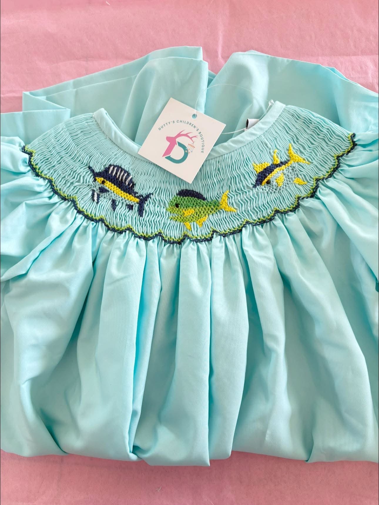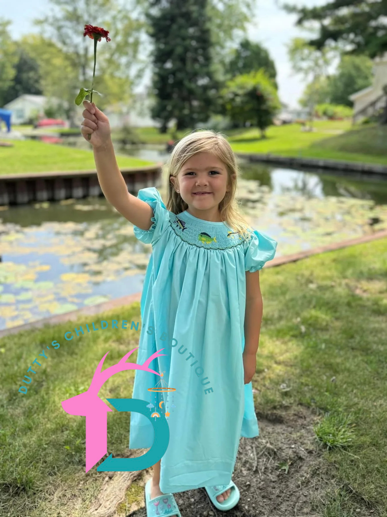 Available in limited sizes, this beautiful blue dress features an offshore fishing-inspired smocked plate, making it perfect for a day of fishing fun!