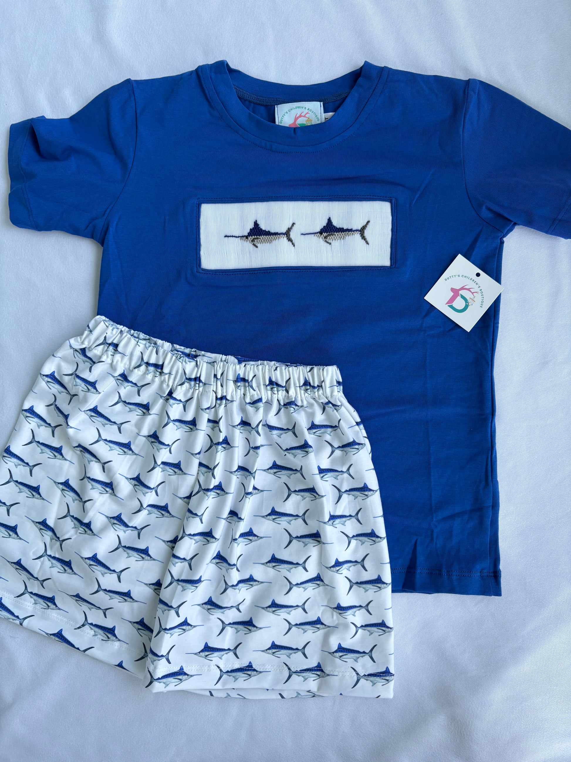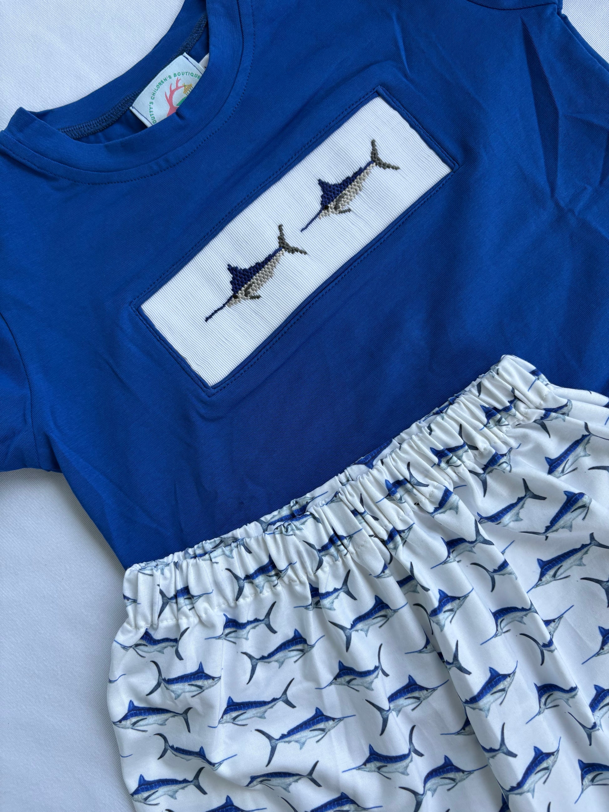 The perfect everyday hand-smocked short set, featuring a charming blue marlin design! Crafted for comfort and style, it fits true to size