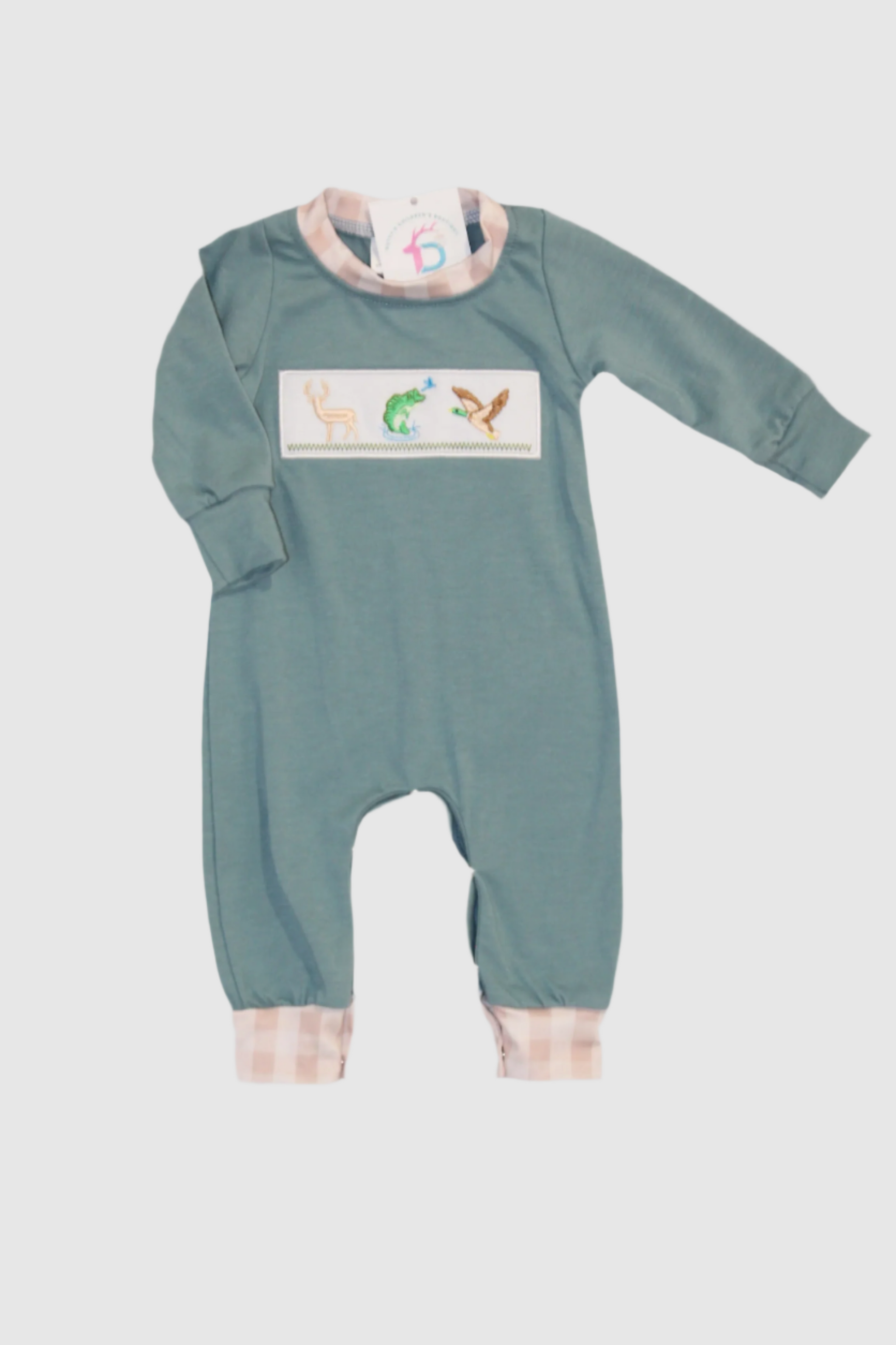 Introduce your little one to the great outdoors with our Southern Boys Romper. Designed with comfort in mind, this romper features charming deer, fish, and duck embroidery. Made to last, it's perfect for all his adventures. Get yours now!
