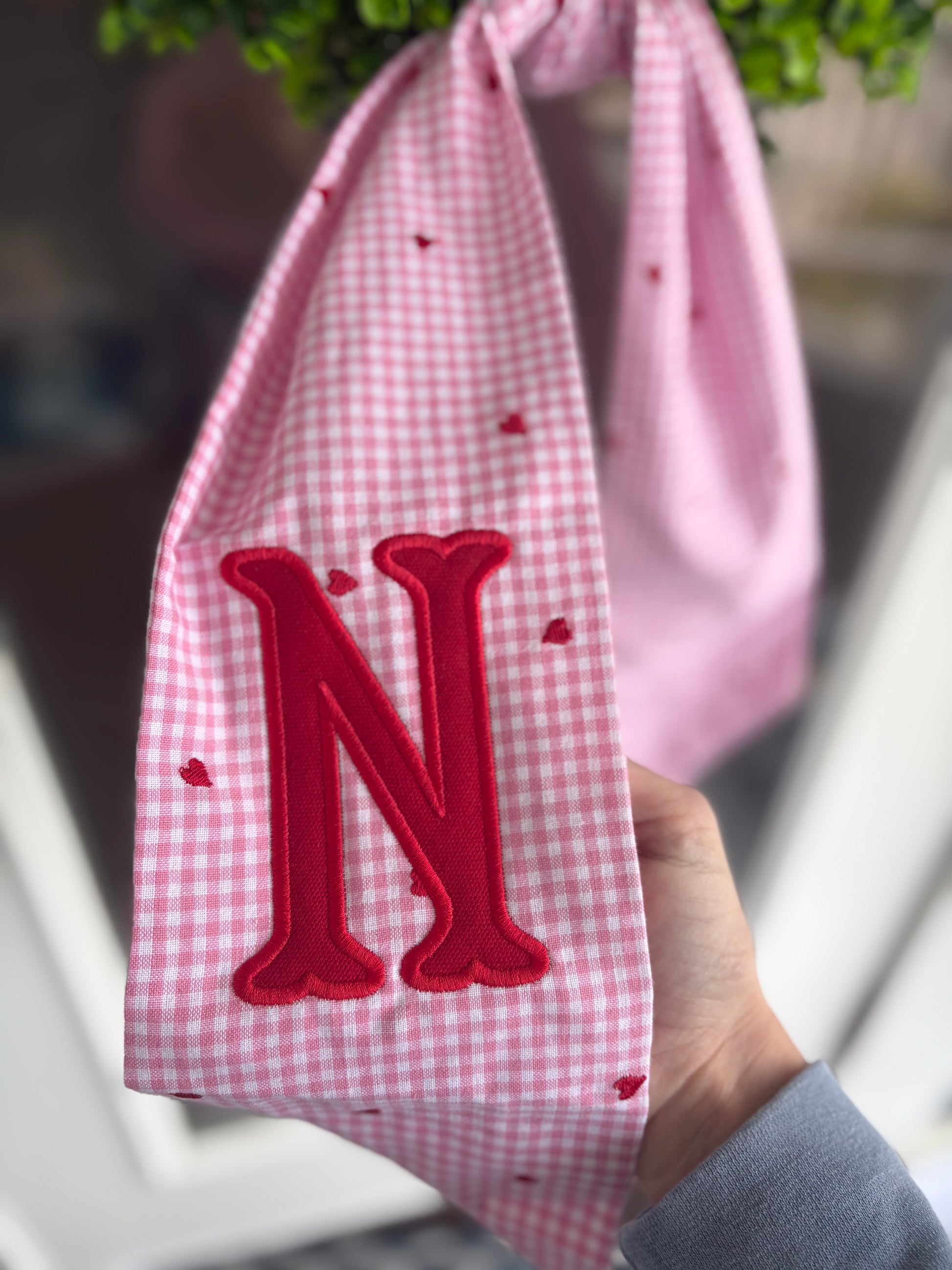 Add the perfect personalized touch to your holiday wreath with this made-to-order appliqué wreath sash! Each sash is crafted with a festive fabric featuring delicately embroidered red hearts, giving it a playful yet polished seasonal charm.